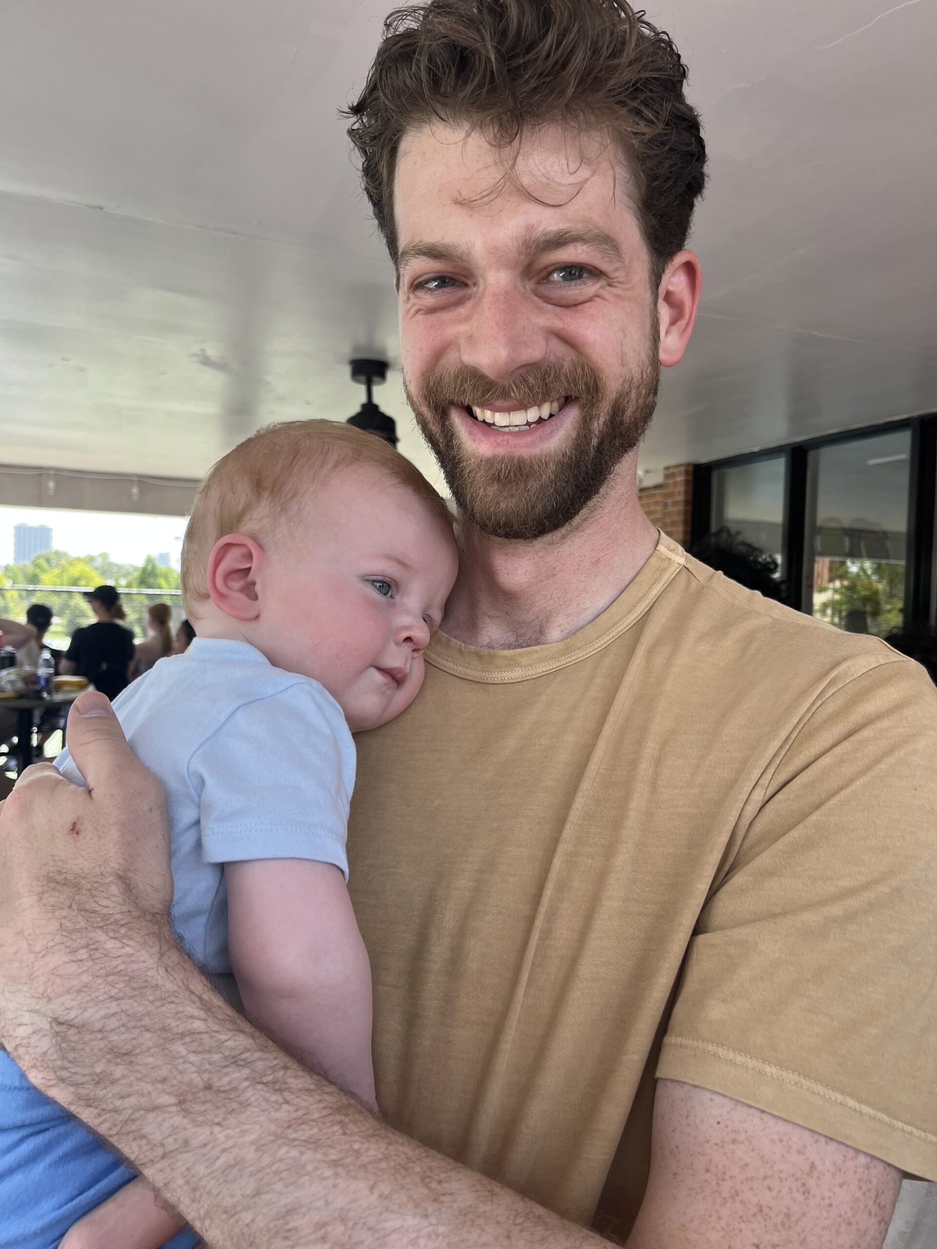man holding baby A fellow guest at the brunch who demonstrated remarkable baby-comforting skills. Either because he is also a Dad or because he looks remarkably like the SIL